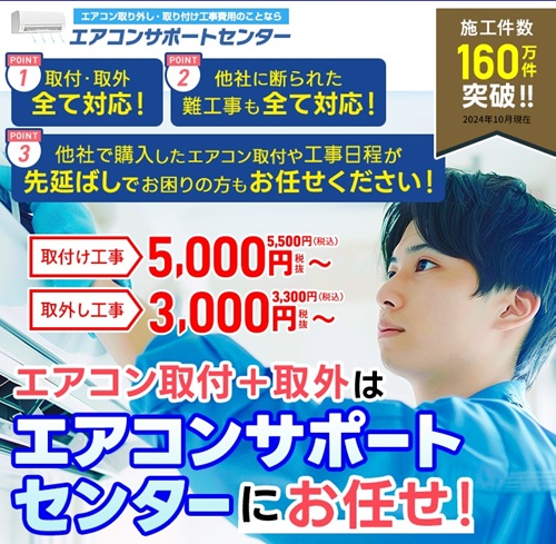 「エアコンサポートセンター」は、リーズナブルな価格でエアコン取り付け・取り外しをおこなってくれる業者です。